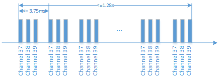 藍牙 LE 有 40 個物理信道(索引從 0~39)從 2.4GHz - 2.4835Hz,其中 37、38 和 39 信道分配給廣播。 在 37、38 或 39 頻道上依次發(fā)送的廣播稱為廣播事件。 相鄰廣播事件的兩個開始之間的距離稱為廣播間隔。 通道可以通過廣播參數(shù)channel_map配置為37、38、39中的任意通道。