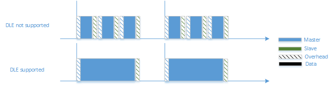 - 確保主設(shè)備和從設(shè)備都支持數(shù)據(jù)長度擴展(DLE)功能,這是藍牙核心協(xié)議 4.2 之后的一個選項功能。 此功能允許最大數(shù)據(jù)包大小從 27 字節(jié)到 251 字節(jié)。 每個數(shù)據(jù)包都有一定的頭部,當Dsize增大時,數(shù)據(jù)包的數(shù)量會減少,頭部的開銷也會減少。