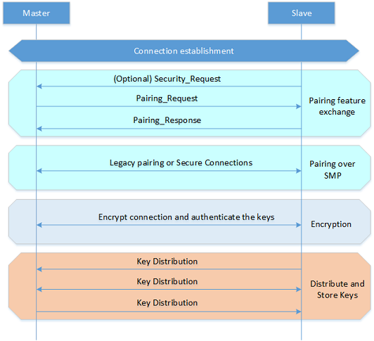 如圖 SMP 流程所示,主設(shè)備可以發(fā)起配對請求來觸發(fā)配對流程,而從設(shè)備可以發(fā)起安全請求來請求主設(shè)備發(fā)起配對請求。