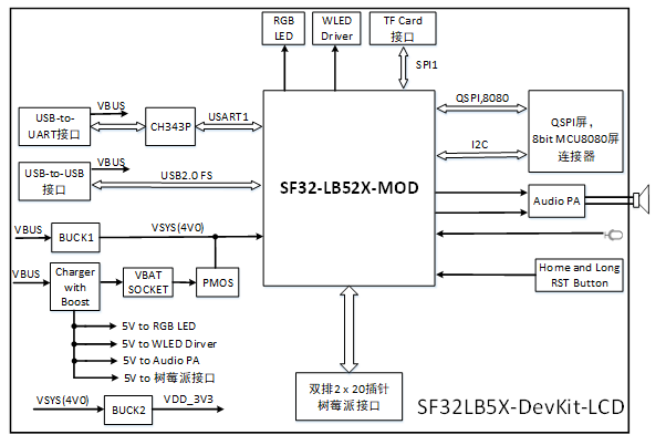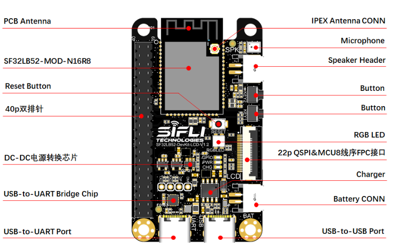 SF32LB52-DevKit-LCD開(kāi)發(fā)板的主板是整個(gè)套件的核心,該主板集成了SF32LB52-MOD-N16R8模組,并提供QSPI和MUC8的LCD連接座